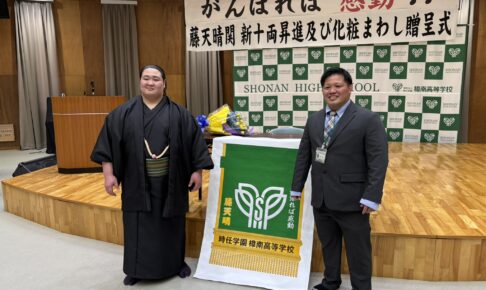 お知らせ記事 藤天晴関(藤島部屋) 新十両昇進報告会、化粧まわし贈呈式 2026.02.27 syonan-sumou-takahiro 皆様いつも樟南高校相撲部の応援ありがとうございます。 2/27(金)の午後から藤天晴関(藤島部屋) の新十両昇進報告会、化粧まわし贈呈式を樟南高校多目的ホールで行いました。 藤天晴関は昨年、樟南高校を卒業し幕下最下位格付…